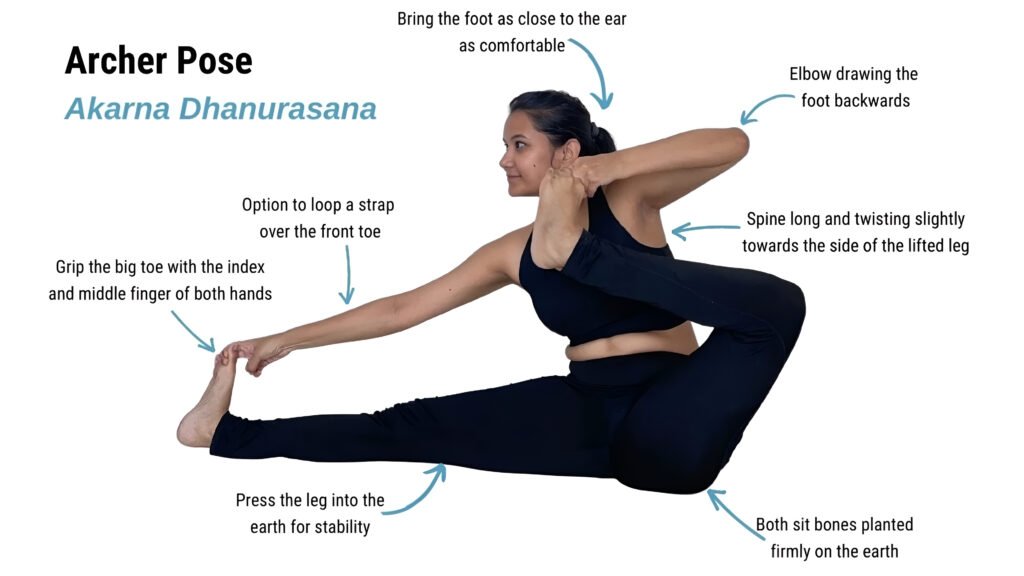 A – Near, Karna- Ear, Dhanu- Bow, Asana- Pose. This pose resembles holding the bow from near your ear!